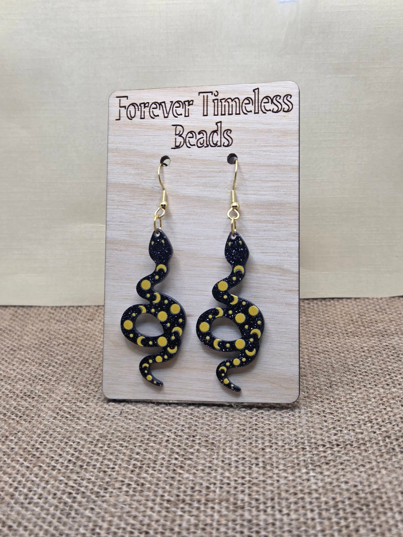 Embrace a mystical vibe with these striking celestial snake earrings. Featuring a swirling snake design adorned with shimmering gold moons and stars against a deep black, glittery background, these lightweight earrings add a touch of cosmic magic to any outfit. Perfect for lovers of unique, bold accessories, these earrings make a captivating statement and a perfect gift for those enchanted by the night sky.