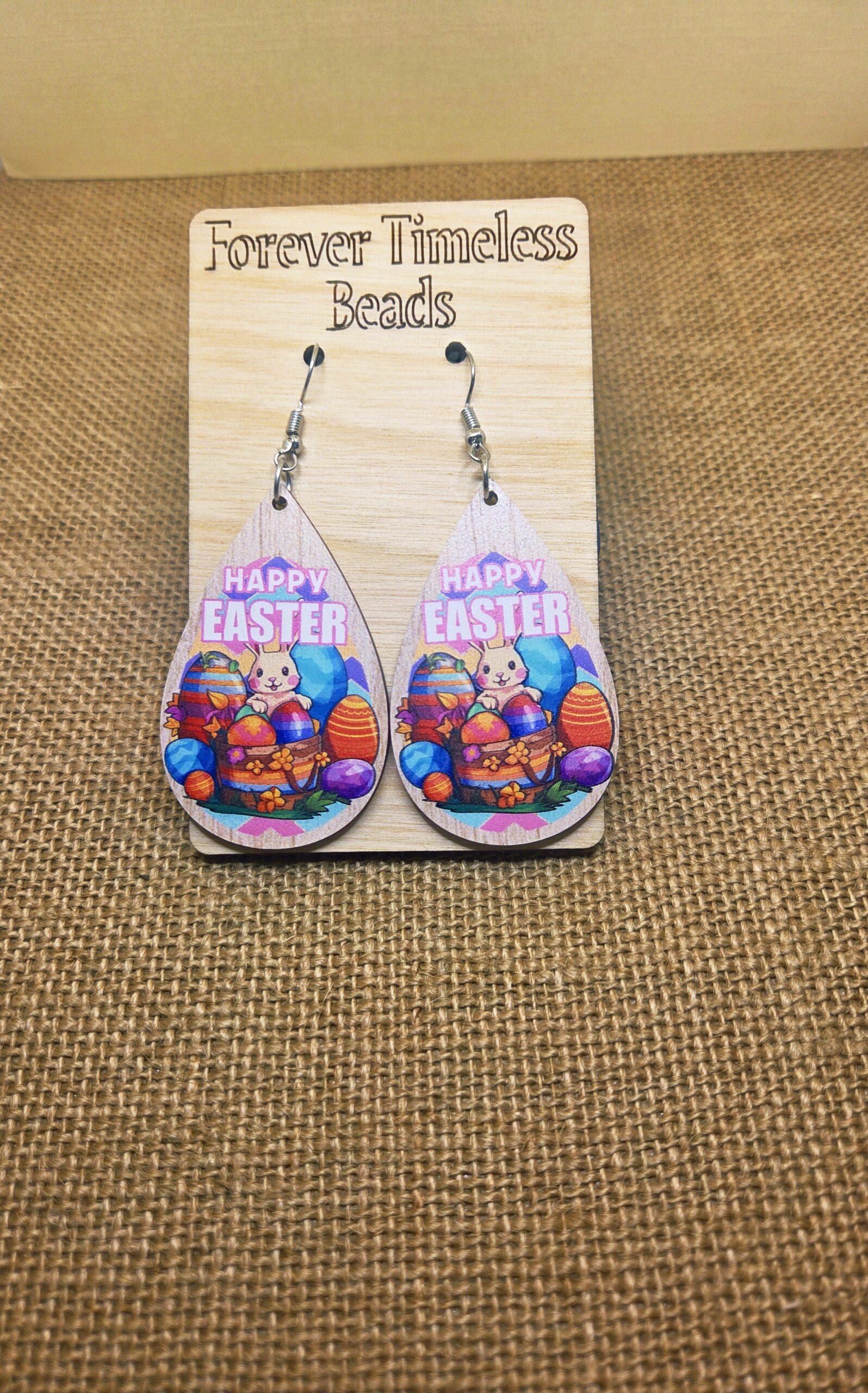 Introducing our delightful Colorful “Happy Easter” Bunny & Eggs Wooden Earrings! These charming earrings feature a playful bunny surrounded by festive Easter eggs, designed to add a splash of color and joy to your spring outfits.